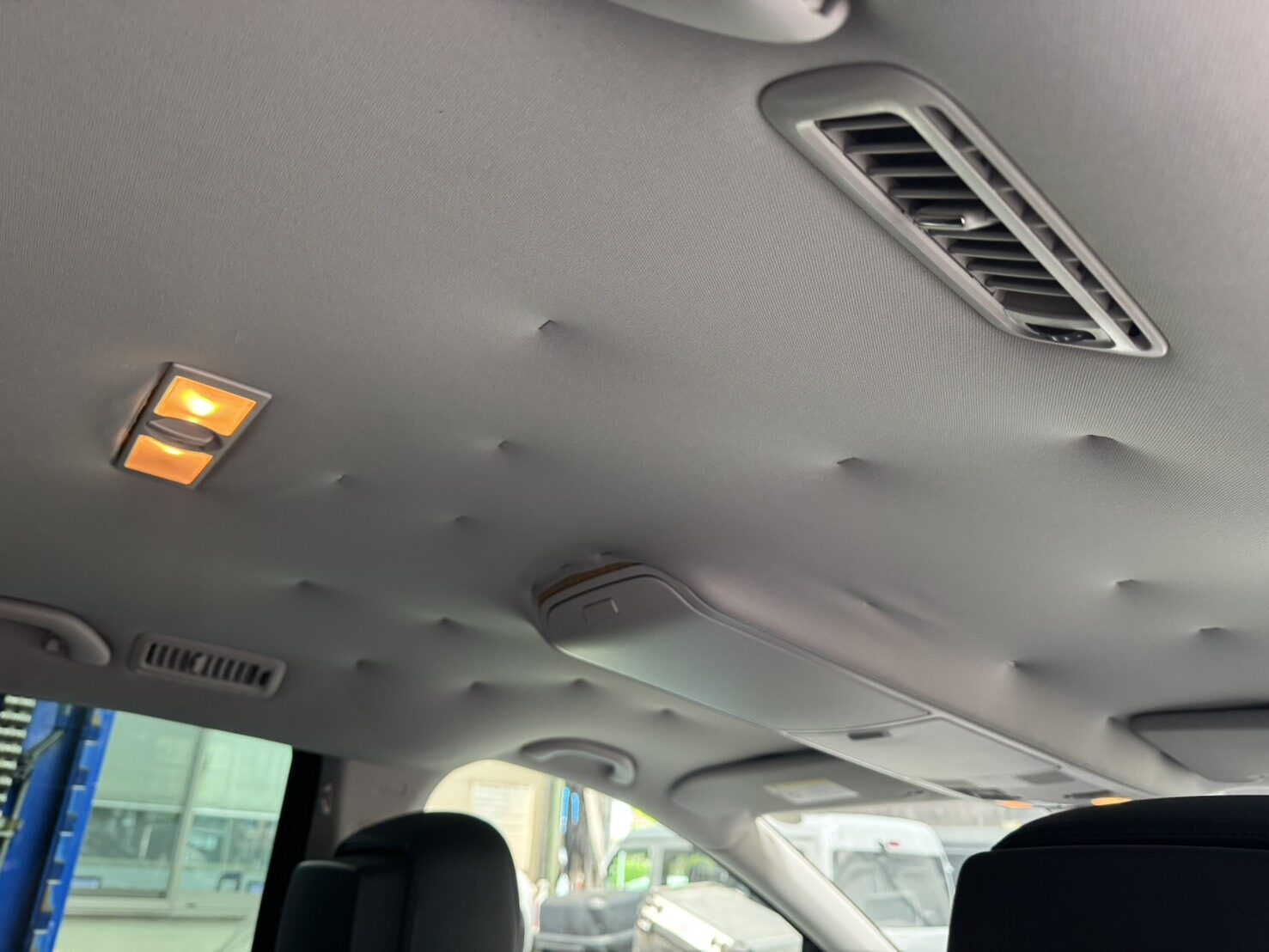 天井の布が全体的に浮き上がり、ライトまわりや後部の部分にシワ・たるみが出ていました。
