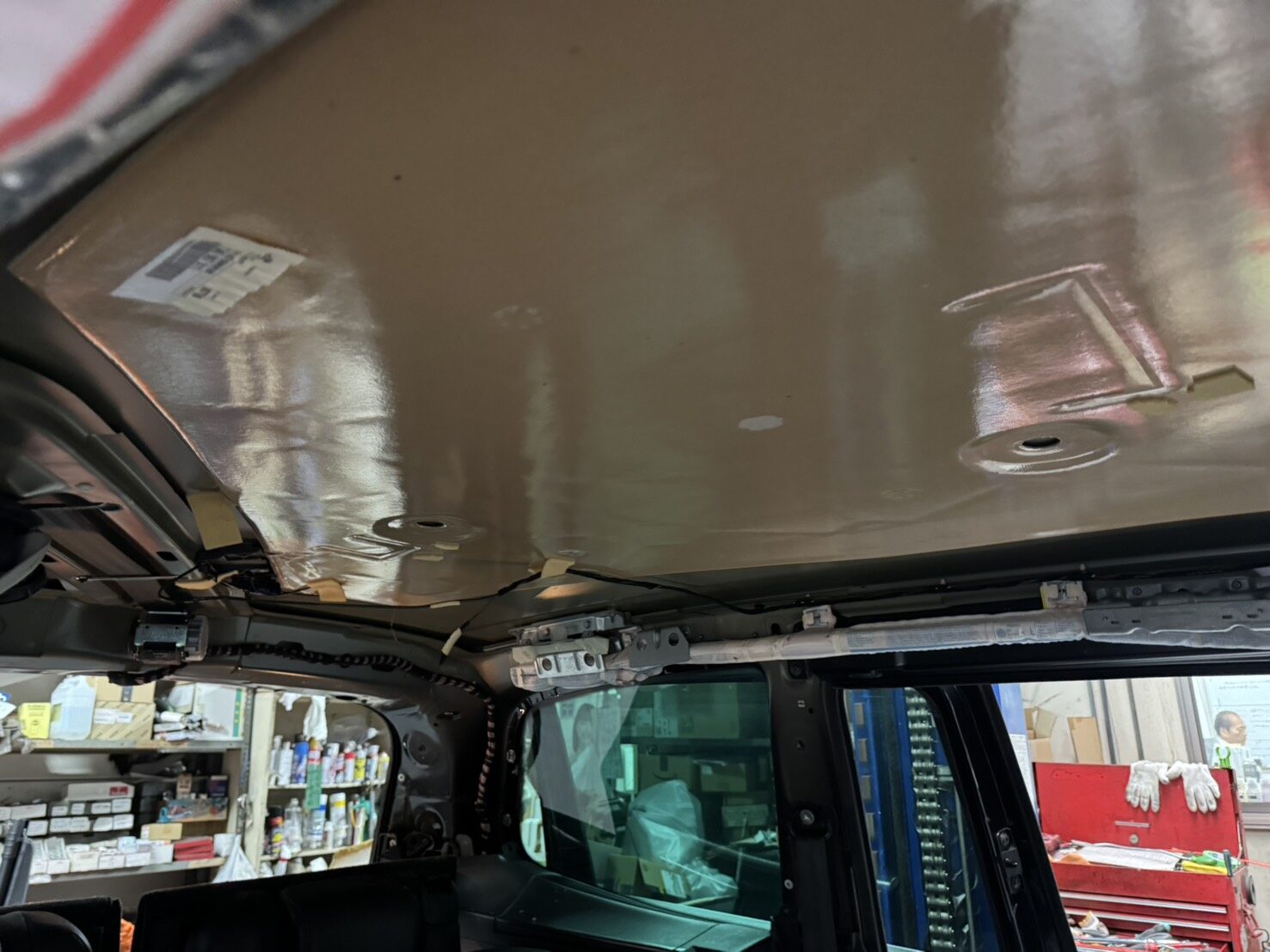 次に、新しい天井生地を専用の耐熱接着剤で貼り込み。