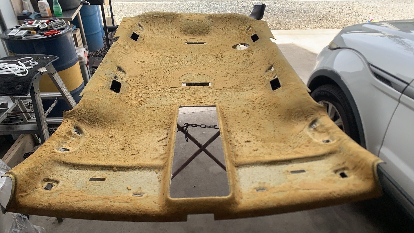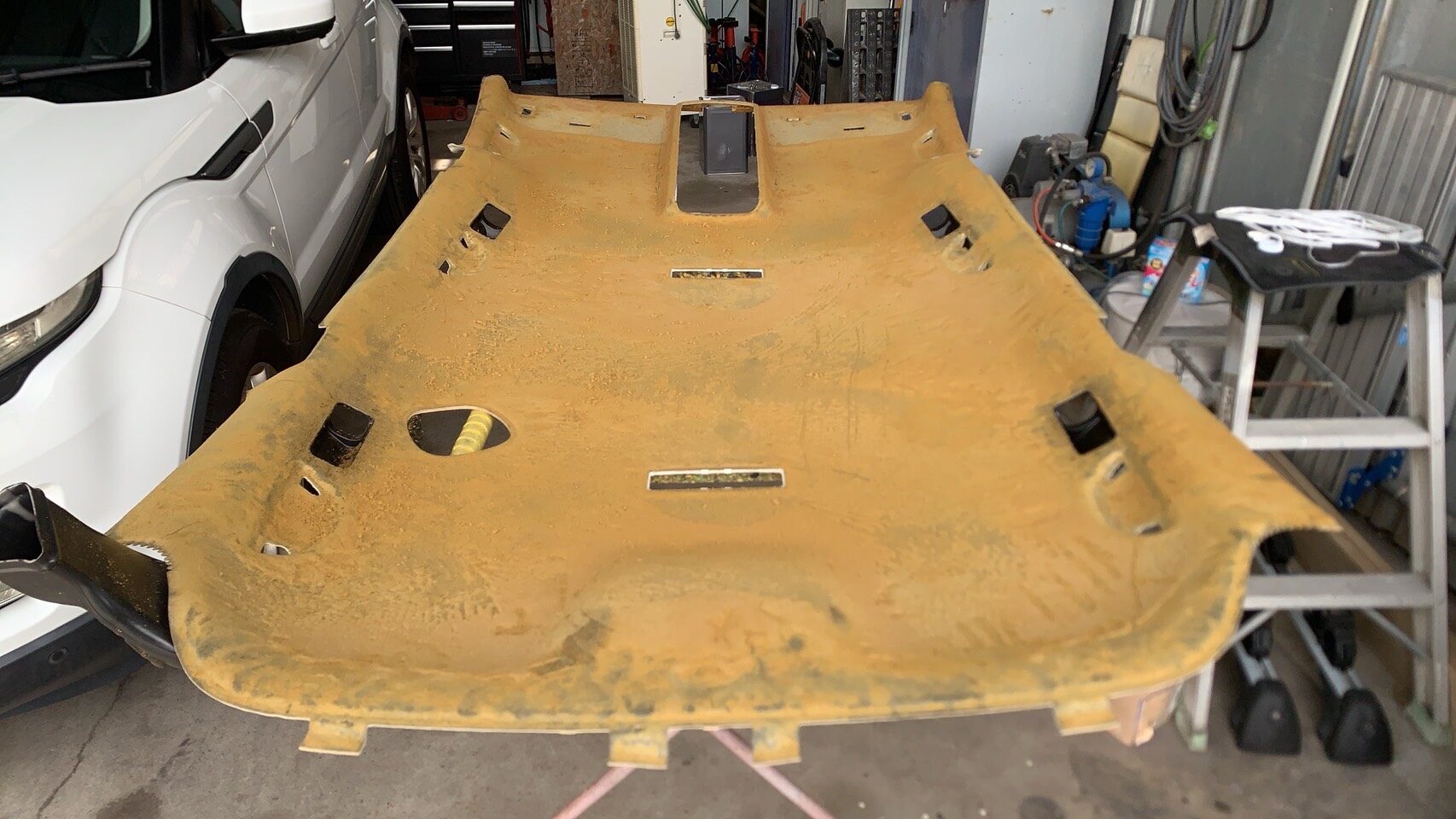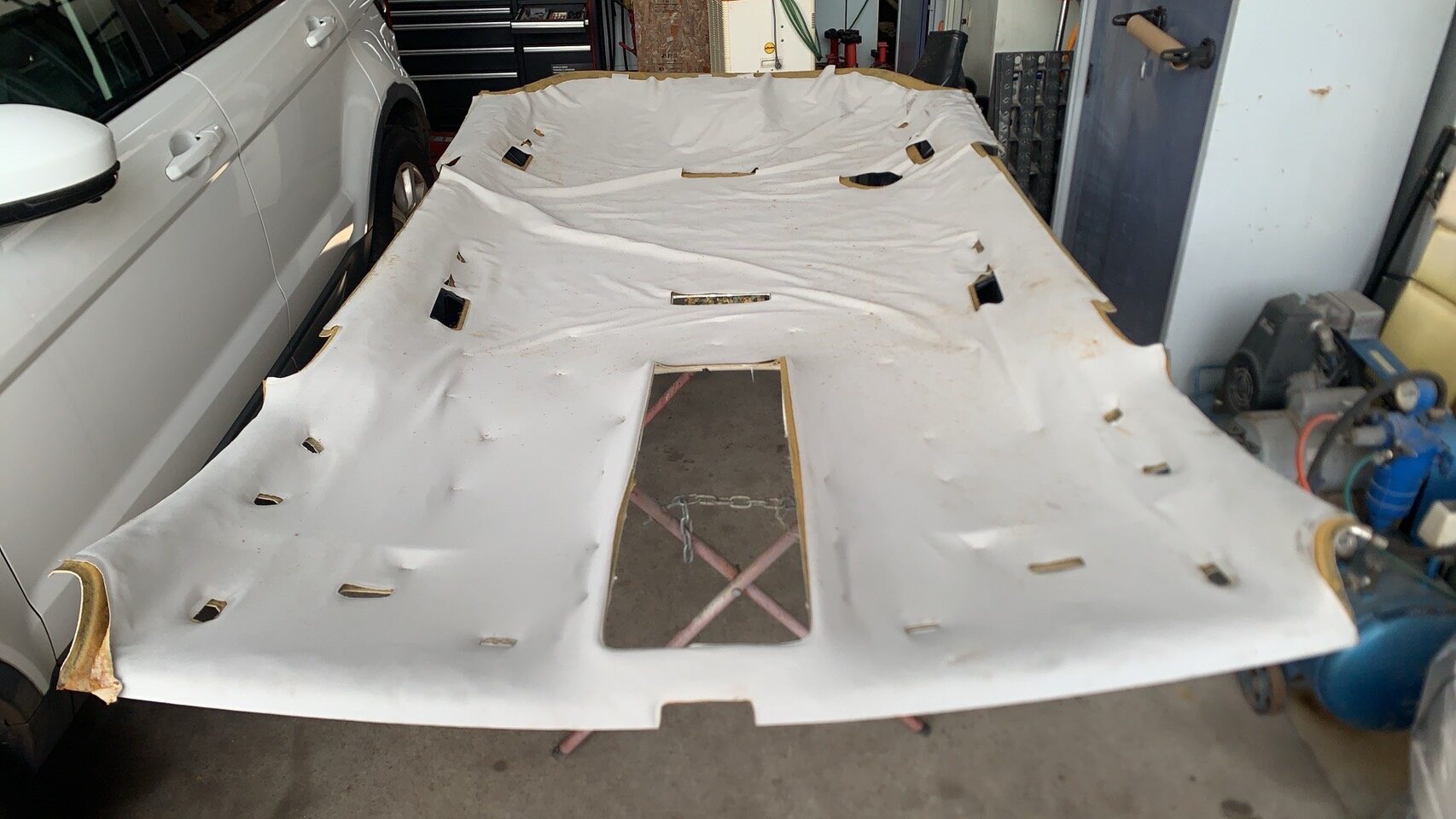 写真のように、天井全体がふくらみ、ところどころピンで仮止めされていましたが、生地の内部のウレタンが完全に劣化している状態でした。